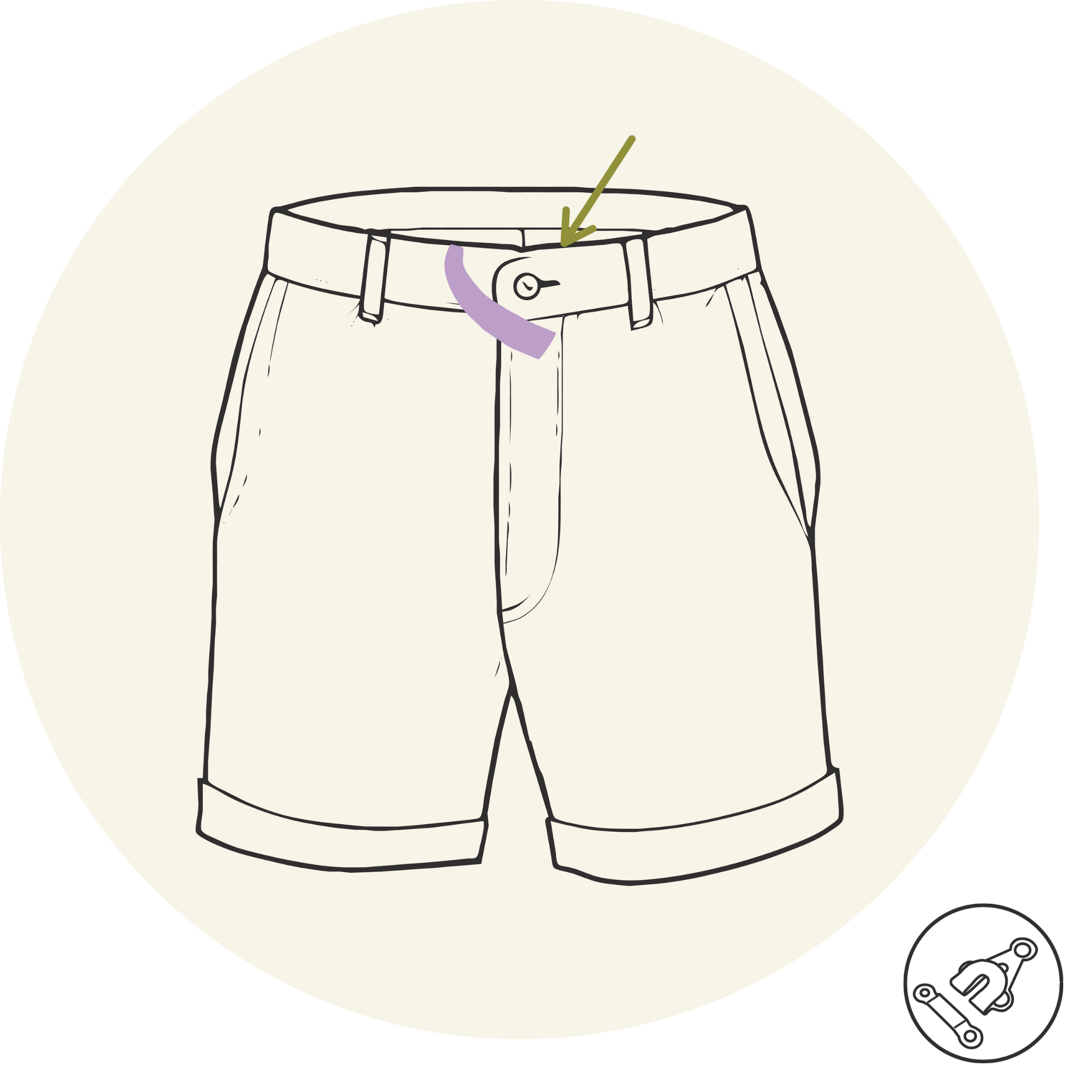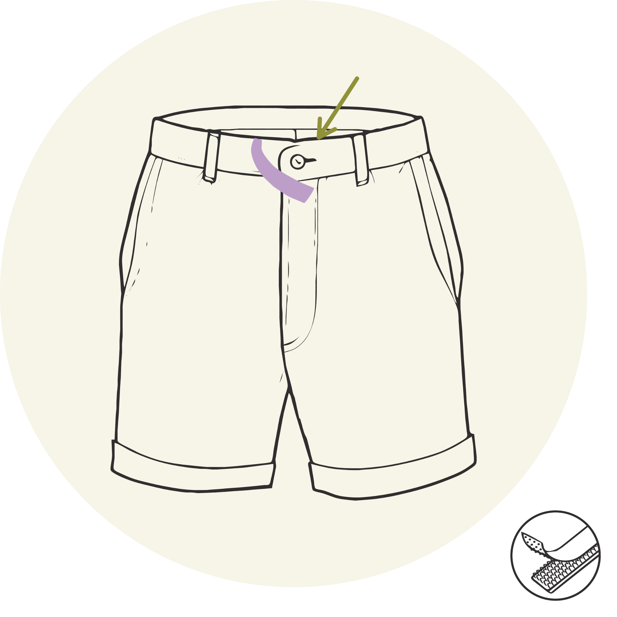 Nous retirons le bouton classique du short et le remplaçons par un scratch ou un crochet, offrant ainsi une alternative pratique et facile à fermer. Le résultat est une fermeture discrète qui permet de conserver le style du short.